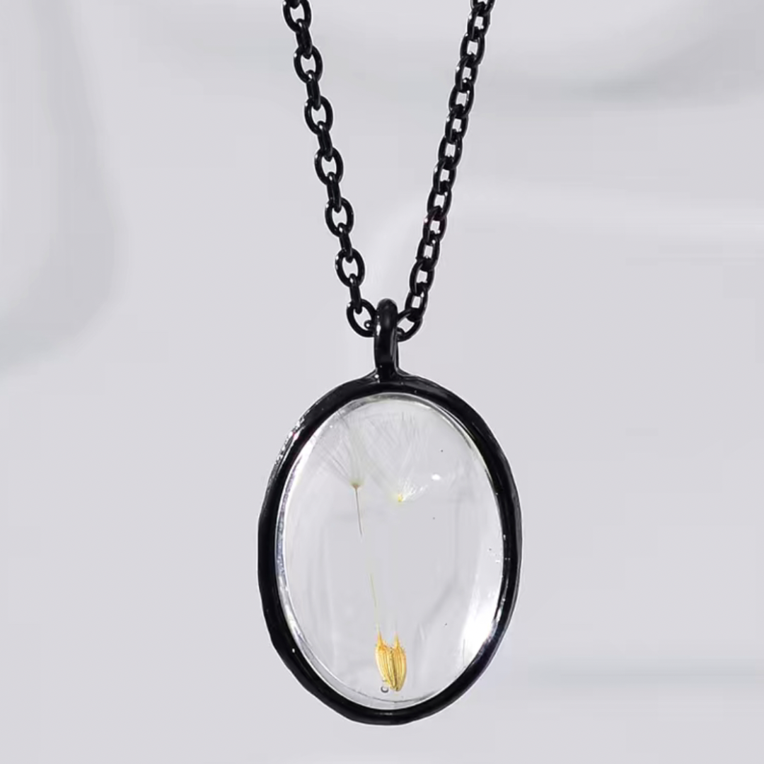 The pendant features two delicate dandelions encased in glass, creating a beautiful and unique look. The black chain adds a touch of elegance and sophistication to the necklace, making it perfect for both casual and formal occasions.