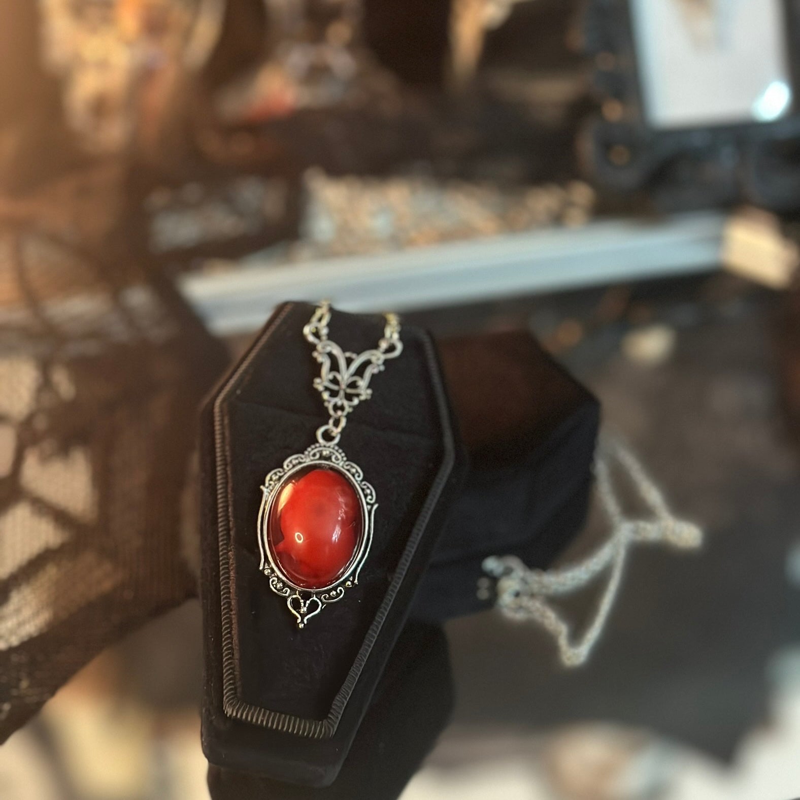 Embrace the dark romance of the Bloody Sunday Necklace. This beautiful and victorian oval-shaped silver ornate necklace has a bloody red center that will be sure to make a statement. Perfect for adding a dash of drama to your ensemble.